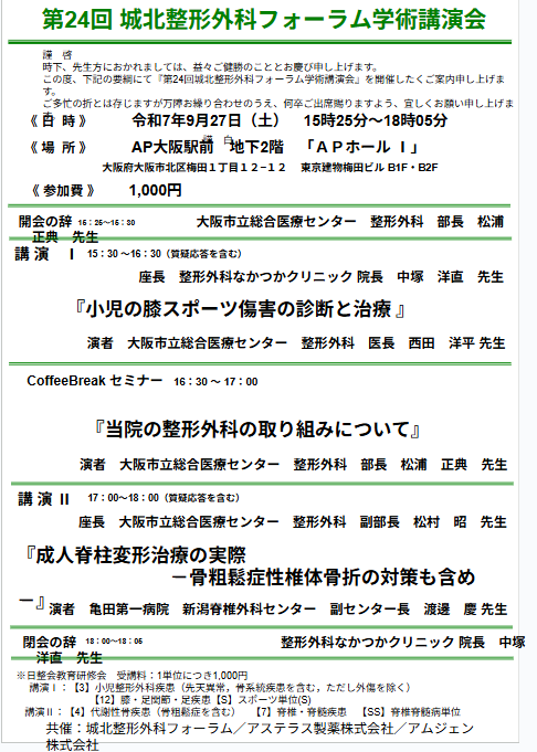 去る令和7年9月27日(土)にAP大阪駅前にて開催されました「第24回 城北整形外科フォー